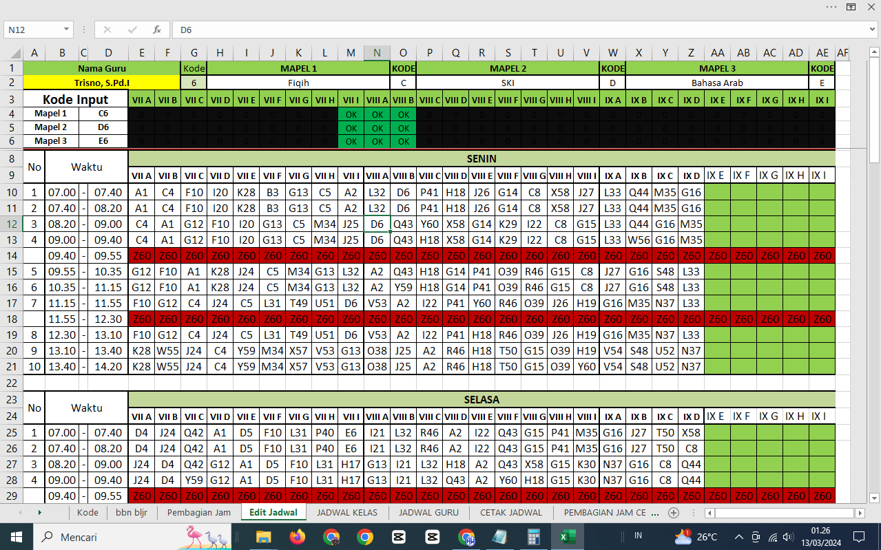 Dan yang terpenting adalah otomatis anti bentrok, ketika anda menyusun jadwal dan terjadi bentrok di suatu kode guru, maka akan diberitahu langsung oleh aplikasi dengan indikator warna.