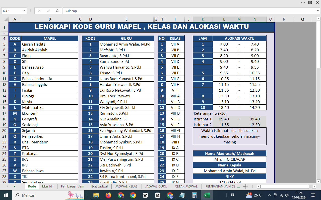 Saya punya Aplikasi Jadwal Pelajaran Anti Bentrok Versi Excel. Dalam hal ini saya review yang memiliki jumlah kelas 27 kelas.