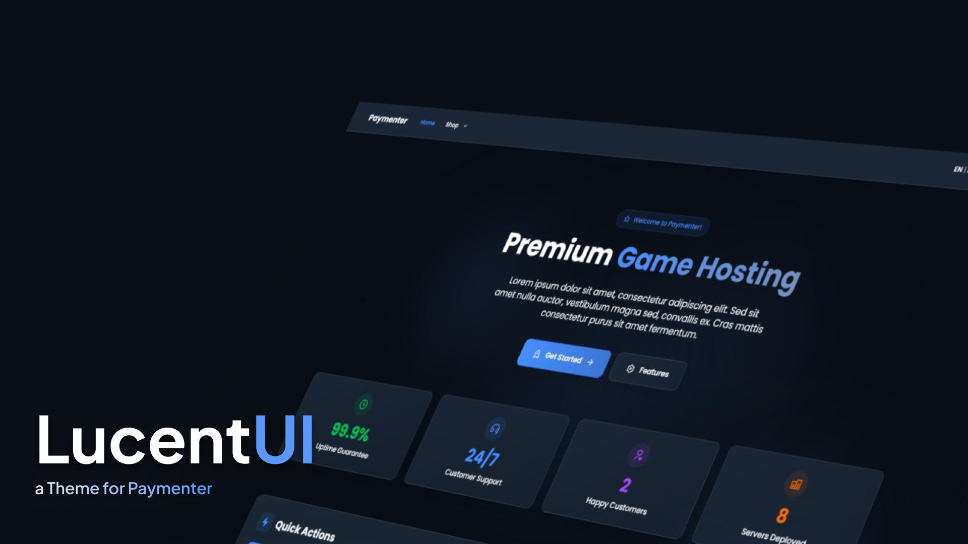 LucentUI adalah tema modern dan minimalis yang dirancang khusus untuk panel Paymenter. Mengutamakan kesederhanaan, animasi lembut, dan performa yang cepat, LucentUI cocok untuk pemilik layanan hosting, panel billing, atau developer yang ingin tampilan profesional dan ringan.