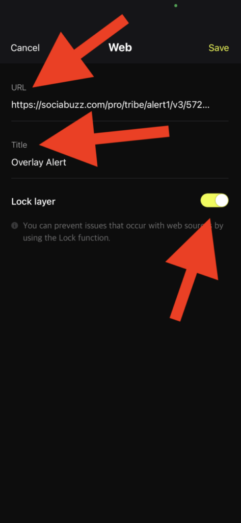 Paste your SociaBuzz overlay link in “URL“, fill in “Title” as desired, and activate “Lock layer“