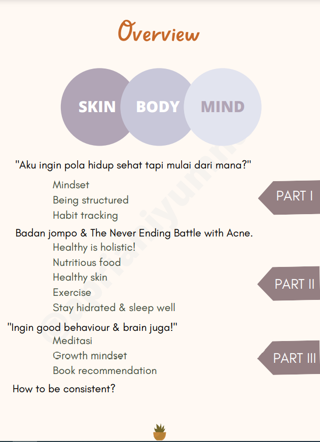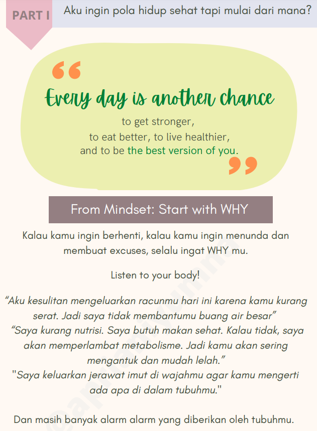 eBook ini berisi cara memulai habits baru, meal plan sample, resep makanan sehat, smoothies 101, tips olahraga, how to less stress & mindful, self-development books recommendation, how to keep on track, how to build mindset, and many more.