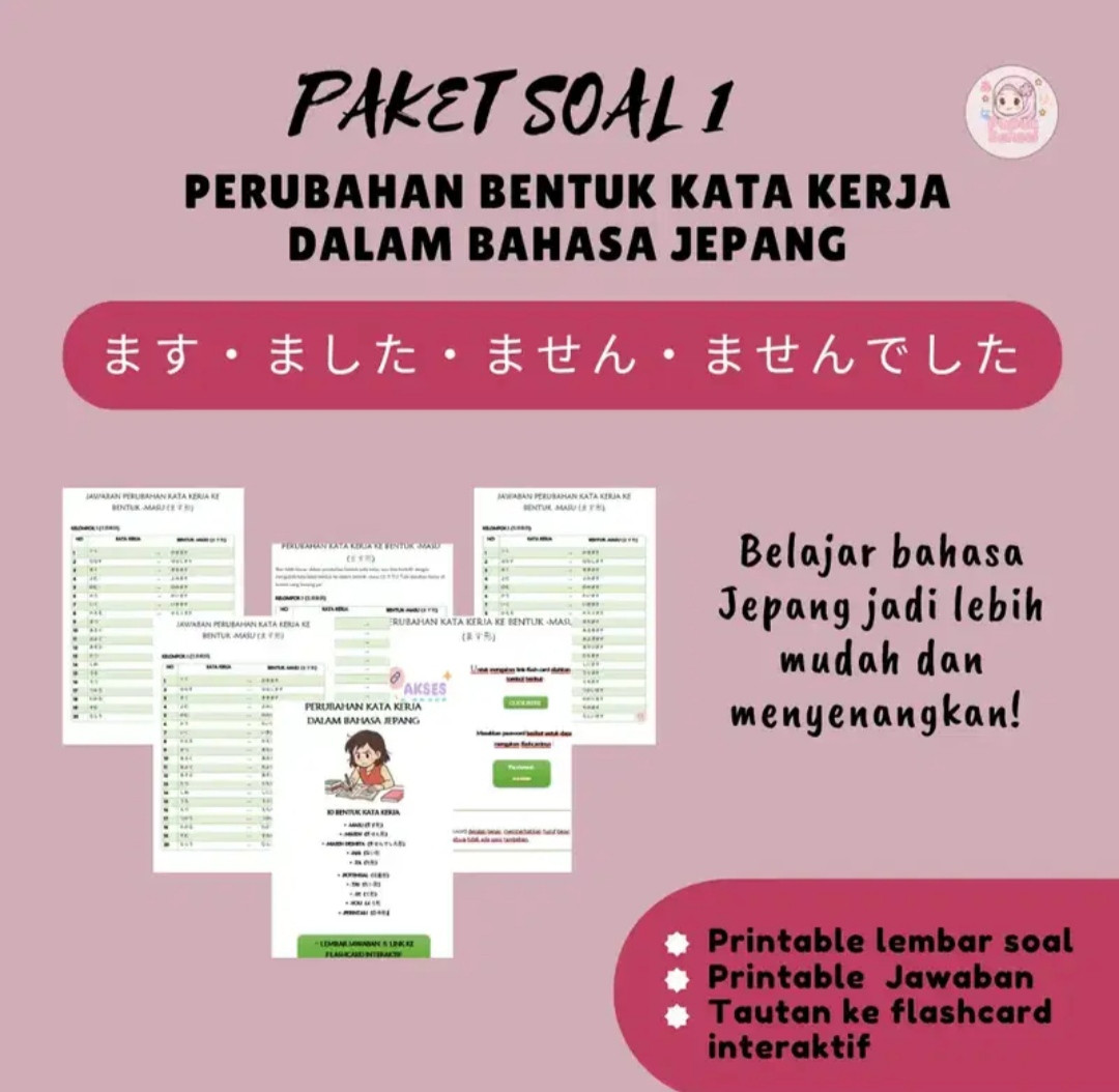Belajar bahasa Jepang jadi lebih mudah dan menyenangkan! Paket soal ini dirancang khusus untuk membantu kamu memahami dan menguasai perubahan bentuk kata kerja dalam bahasa Jepang, termasuk bentuk masu, mashita, masen, nai, dan ta.