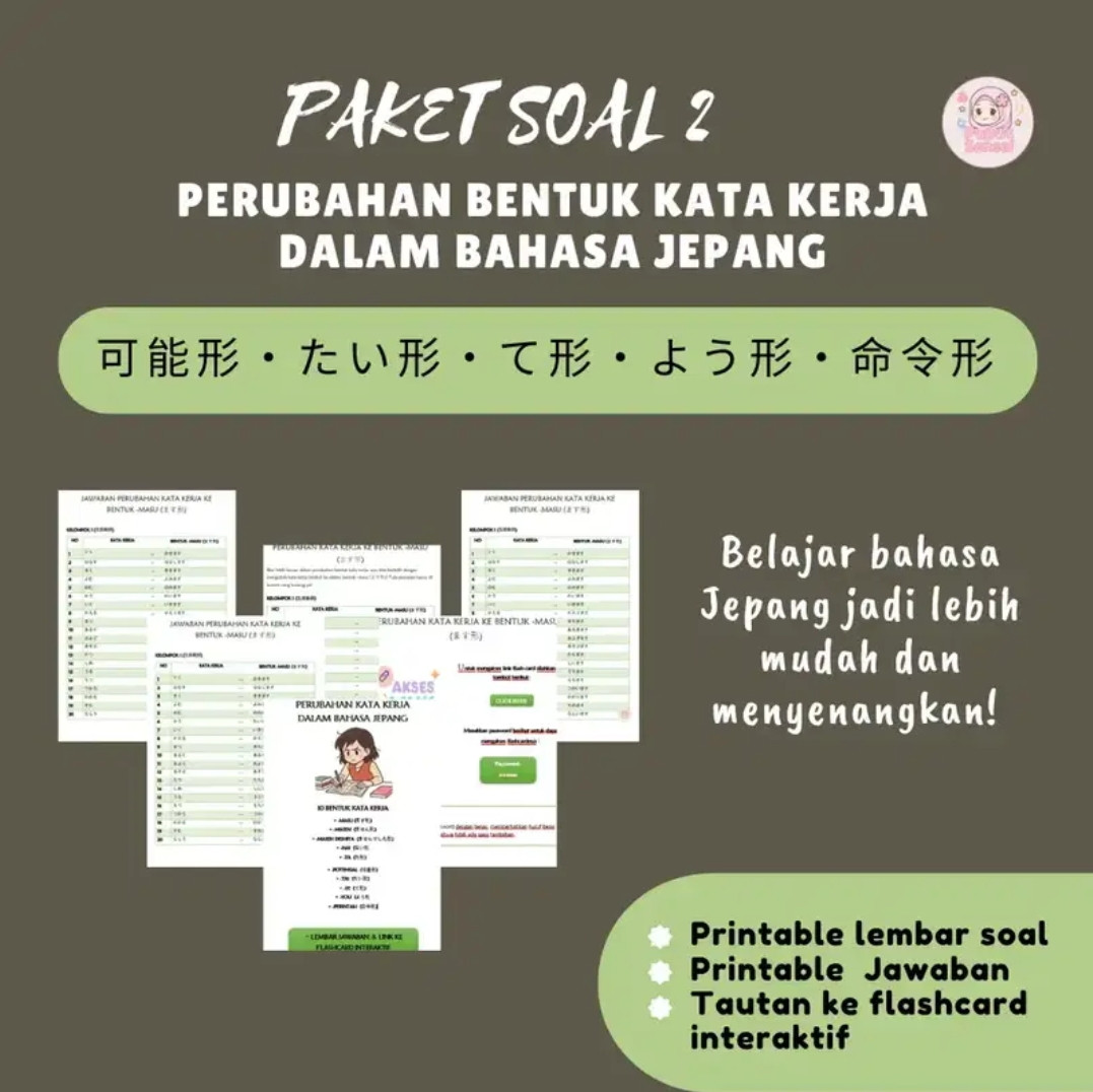 Belajar bahasa Jepang jadi lebih mudah dan menyenangkan! Paket soal ini dirancang khusus untuk membantu kamu memahami dan menguasai perubahan bentuk kata kerja dalam bahasa Jepang, termasuk bentuk potensial, tai, te, you, dan perintah.