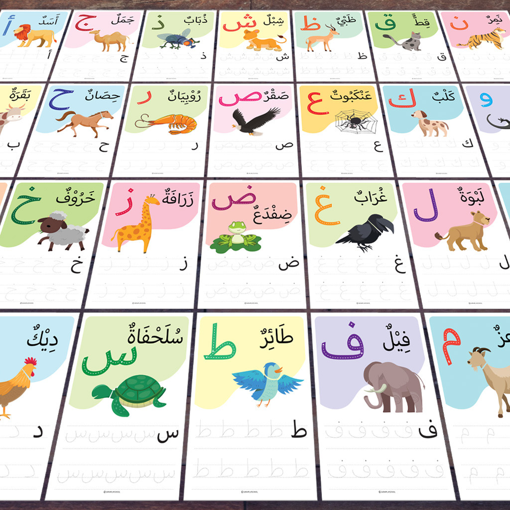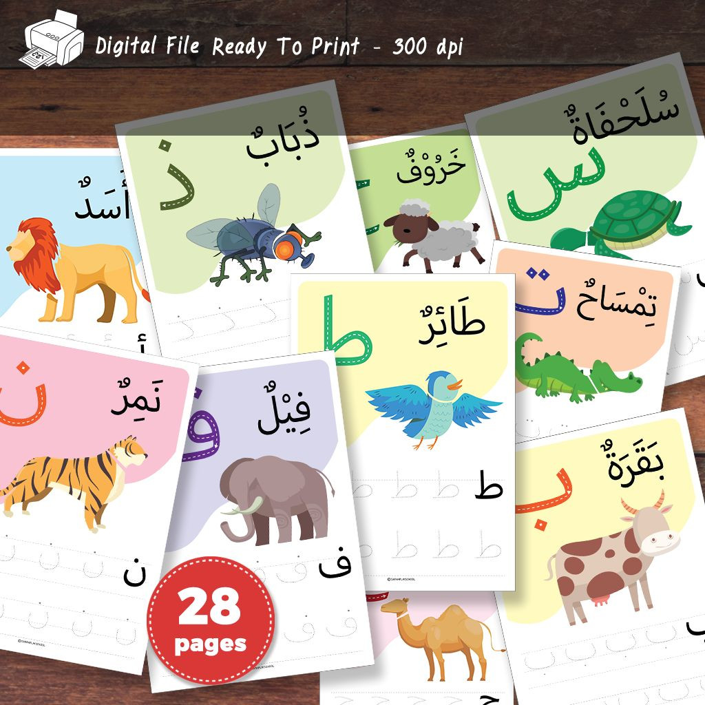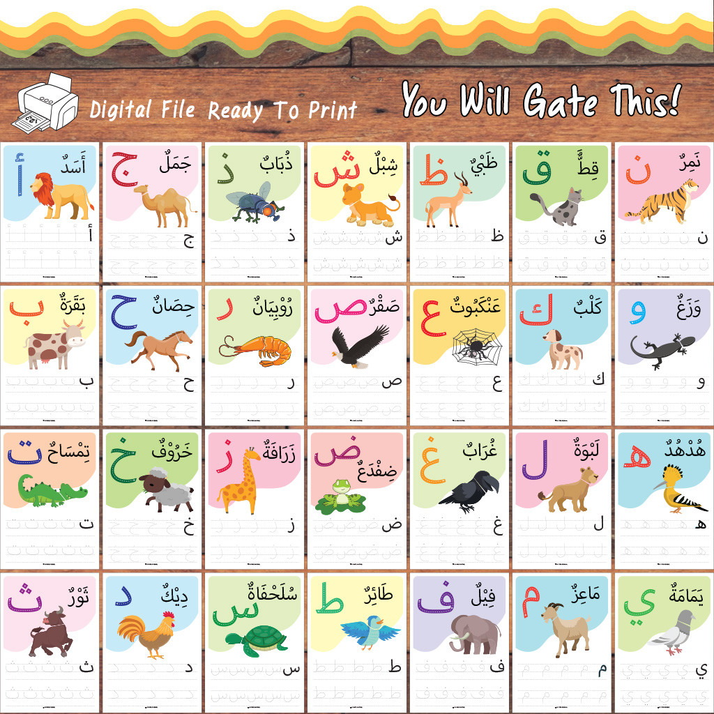 Nama Hewan dalam Huruf Arab dan Hijaiyah, Menjiplak dan Menulis, Alfabet Arab, Lembar Kerja Anak Muslim