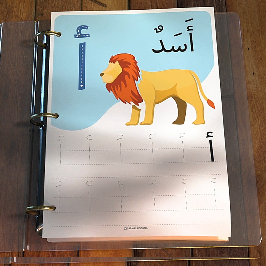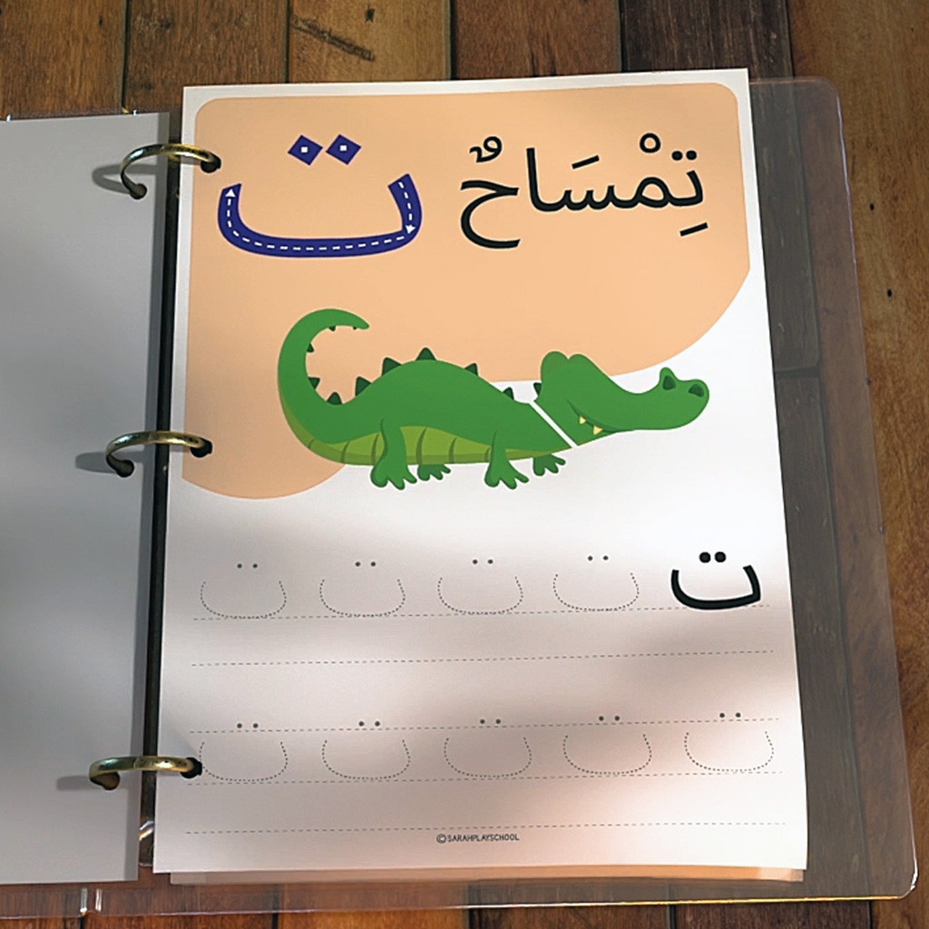 Lembar kerja ini sangat cocok untuk pemula dan anak TK untuk belajar alfabet Arab. Setiap halaman berisi huruf Arab dengan latihan menjiplak dan menulis, serta contoh nama hewan sesuai awal huruf hijaiyah